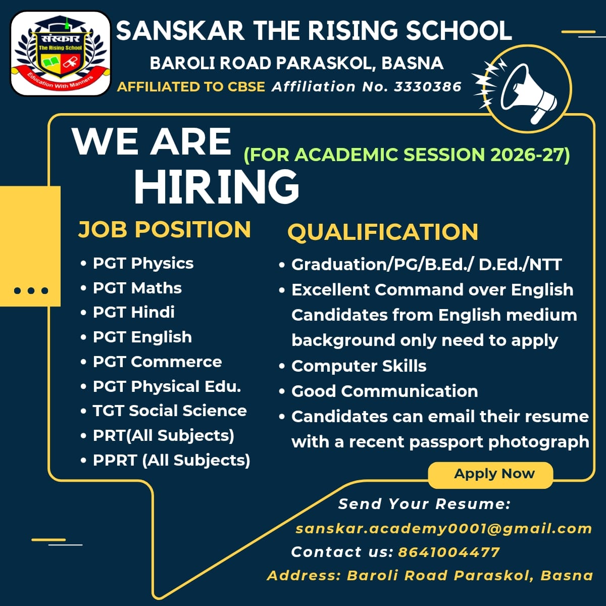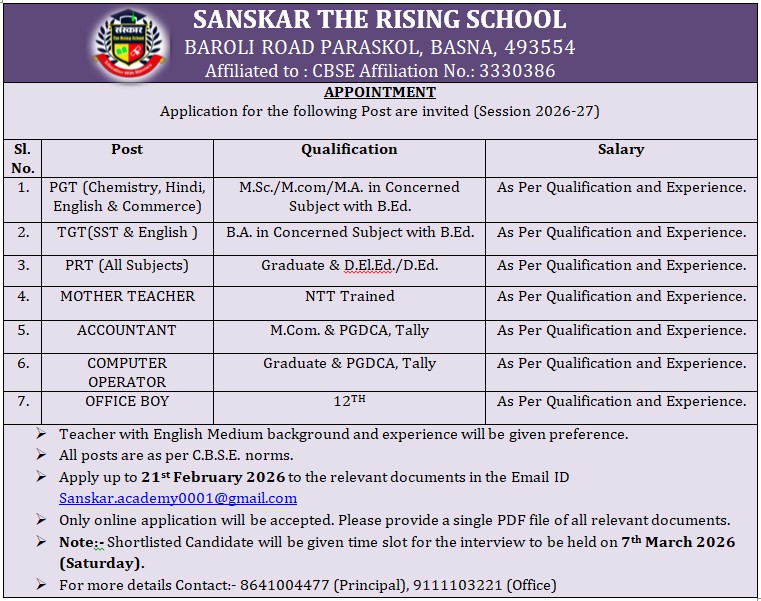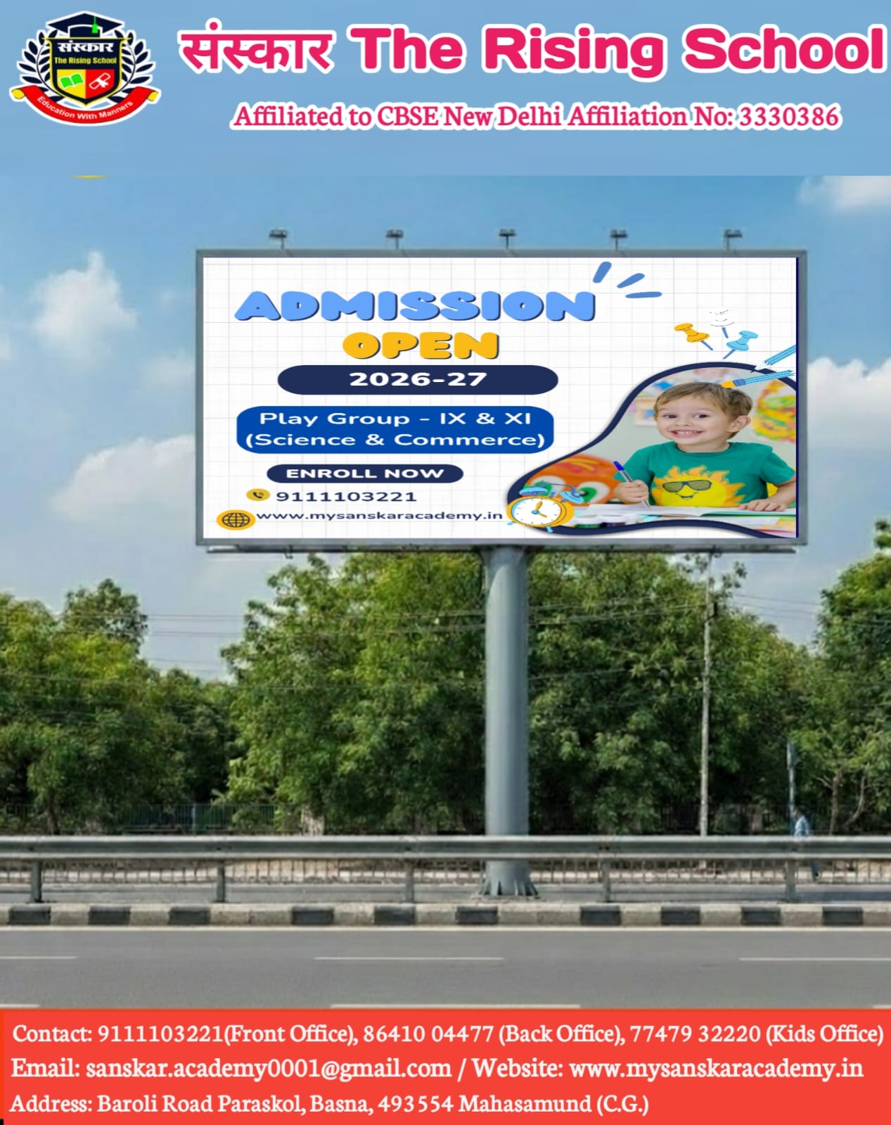 Sanskar The Rising School was established in 2017. It is a Co-Educational school affiliated to CBSE. It is managed by Smt. Vinidevi Educational society. Sanskar The Rising School was opened keeping in mind the need to impart holistic education to the students of Basna.